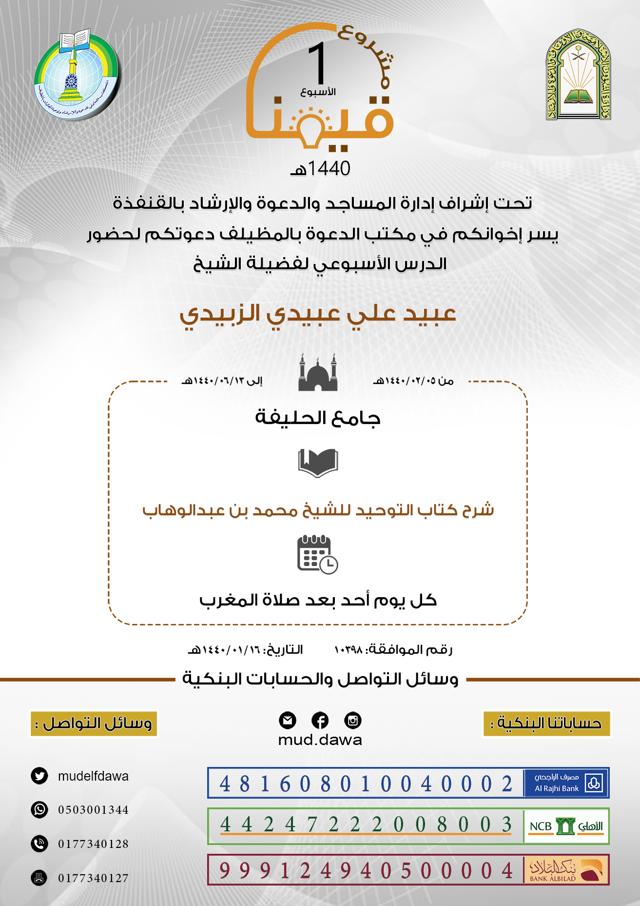 تحت إشراف إدارة المساجد والدعوة والإرشاد بالقنفذة يسر إخوانكم في مكتب الدعوة بالمظيلف دعوتكم لحضور الدرس الأسبوعي كل يوم أحد بعد صلاة المغرب بعنوان شرح كتاب التوحيد للشيخ محمد بن عبدالوهاب لفضيلة الشيخ/ عبيد علي عبيدي الزبيدي ابتداءً من تاريخ: 05-02-1440هـ وانتهاءً بتاريخ: 13-06-1440هـ بجامع الحليفة رقم الموافقة: 10398 التاريخ: 16-01-1440هـ.