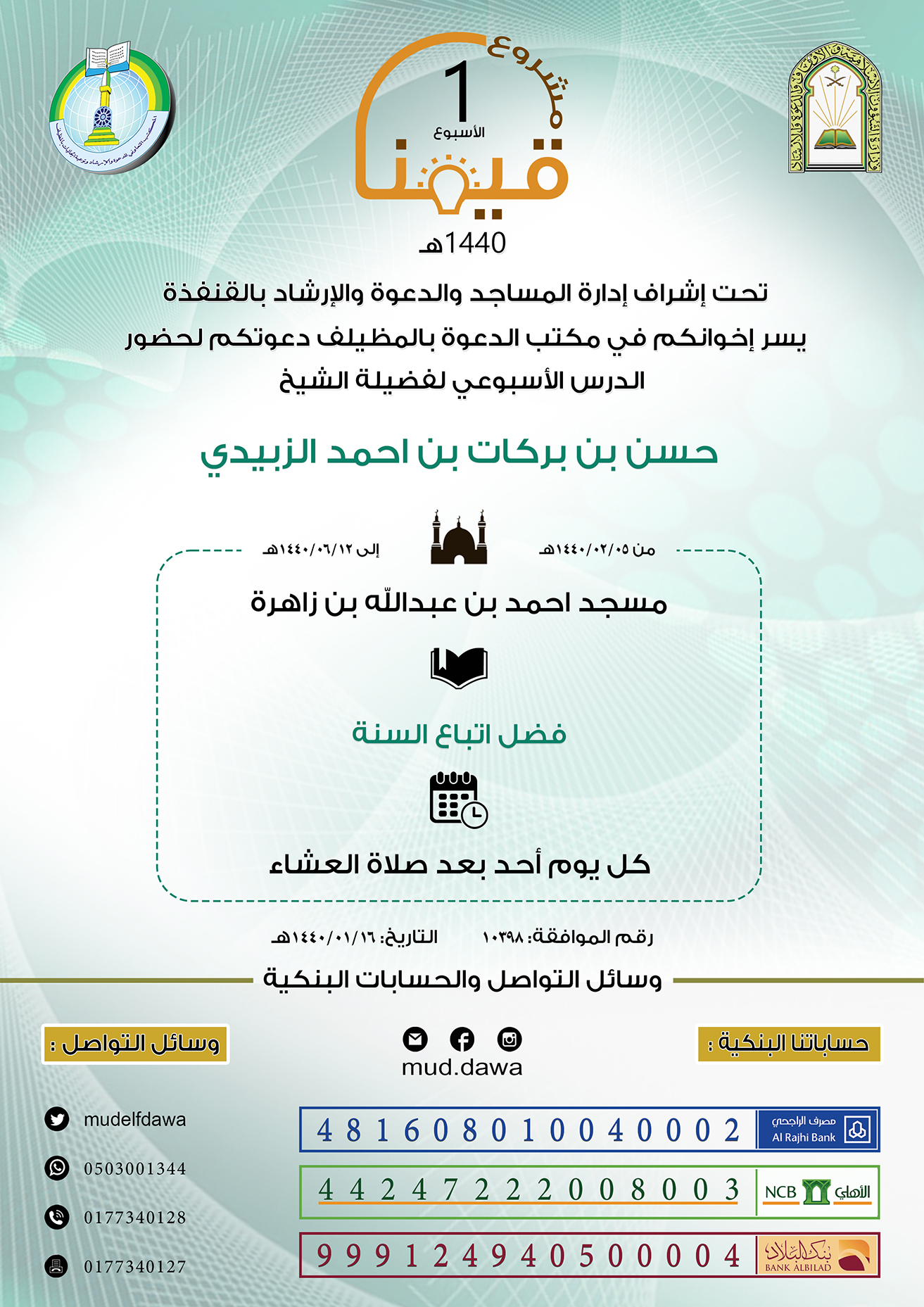 تحت إشراف إدارة المساجد والدعوة والإرشاد بالقنفذة يسر إخوانكم في مكتب الدعوة بالمظيلف دعوتكم لحضور الدرس الأسبوعي كل يوم أحد بعد صلاة العشاء بعنوان فضل اتباع السنة لفضيلة الشيخ/ حسن بن بركات بن احمد الزبيدي ابتداءً من تاريخ: 05-02-1440هـ وانتهاءً بتاريخ: 12-06-1440هـ بجامع الشيخ عبدالله السويلم (الجامع الكبير بالمظيلف) رقم الموافقة: 10398 التاريخ: 16-01-1440هـ