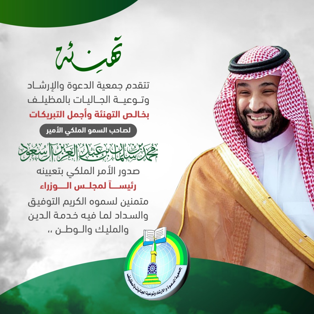 تتقدم جمعية الدعوة والإرشاد وتوعية الجاليات بالمظيلف بخالص التهنئة وأجمل التبريكات لصاحب السمو الملكي الأمير محمد بن سلمان بن عبدالعزيز آل سعود بمناسبة صدور الأمر الملكي بتعيينه رئيساً لمجلس الوزراء متمنين لسموه الكريم التوفيق والسداد لما فيه خدمة الدين والمليك والوطن.